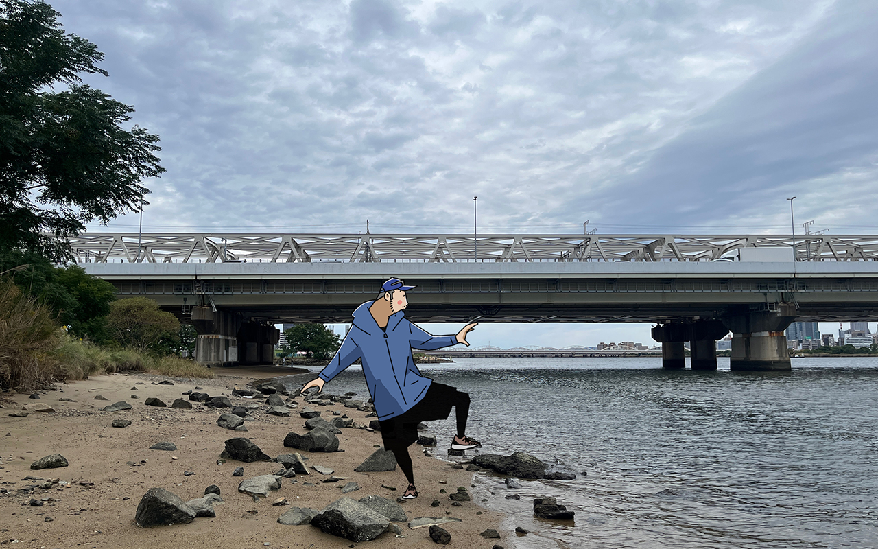 川のそばまで寄ると、砂浜が見えてきました。淀川はだいたいコンクリートの護岸のイメージだったので、まさか砂浜があるとは想像していませんでした。この砂がここでハゼが釣れる所以なのかもしれません。