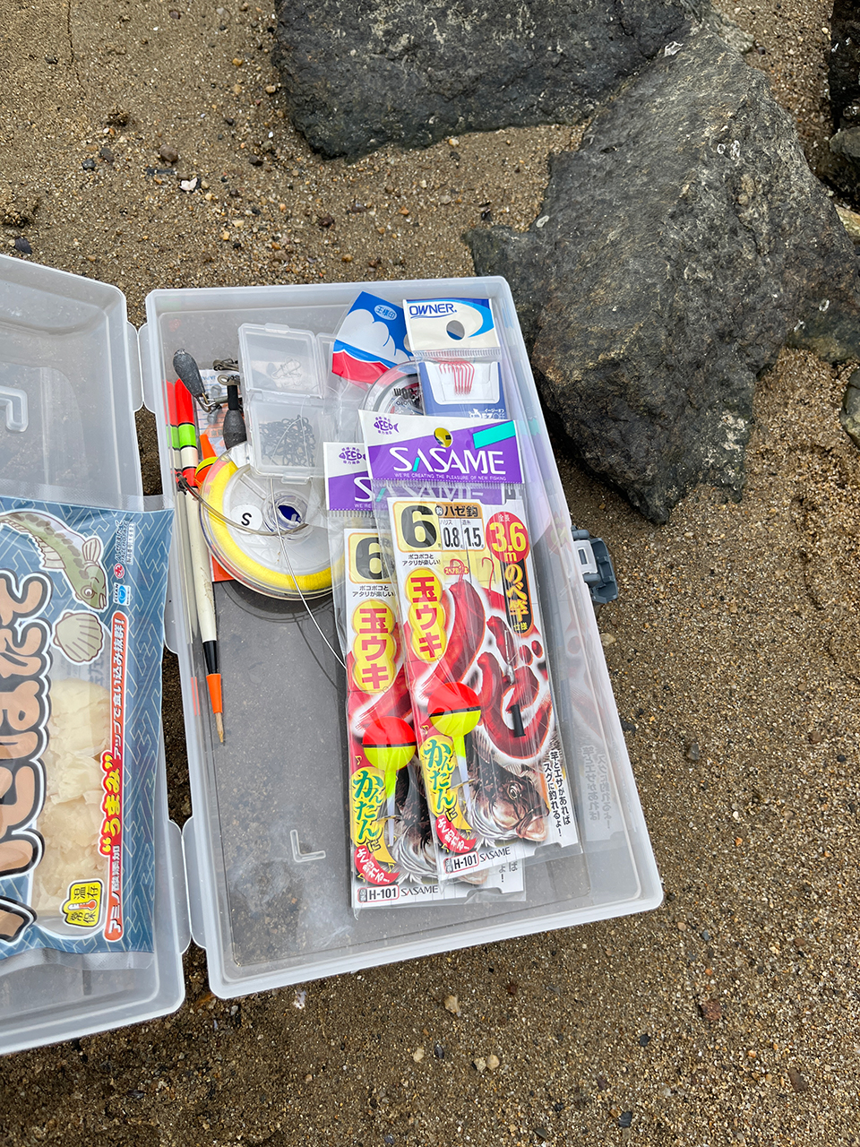 今日使う餌は「イソメ」だそうです。どんなものかはわかりませんが、餌を受け取るTさんの手元にチラリと見えたものがそれだとすれば、いささか不安です。