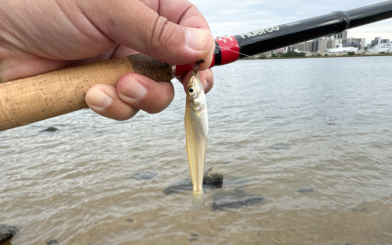 浮きを外してみたり、リール付きの竿を使ってみたりと、いろいろ試しながら釣っていると、釣り上げたTさんが声を上げます。近づいて竿先を見ると、ハゼとは違うキラキラ光る小さな魚がかかっています。