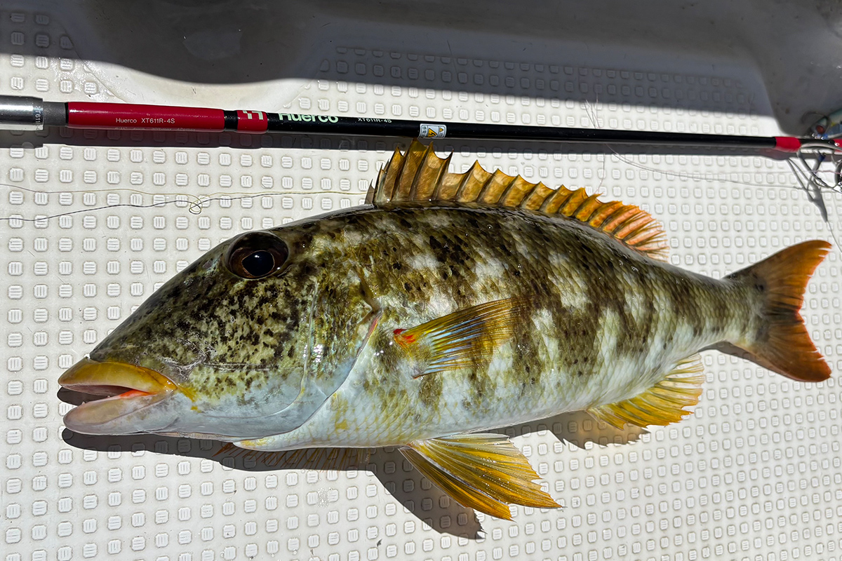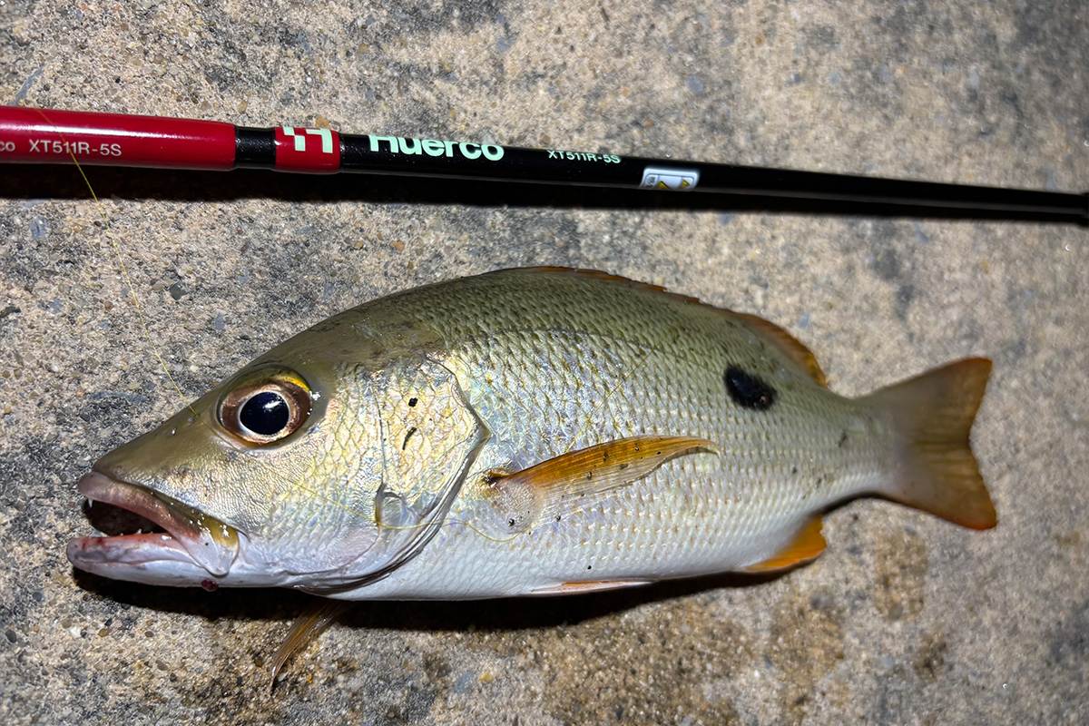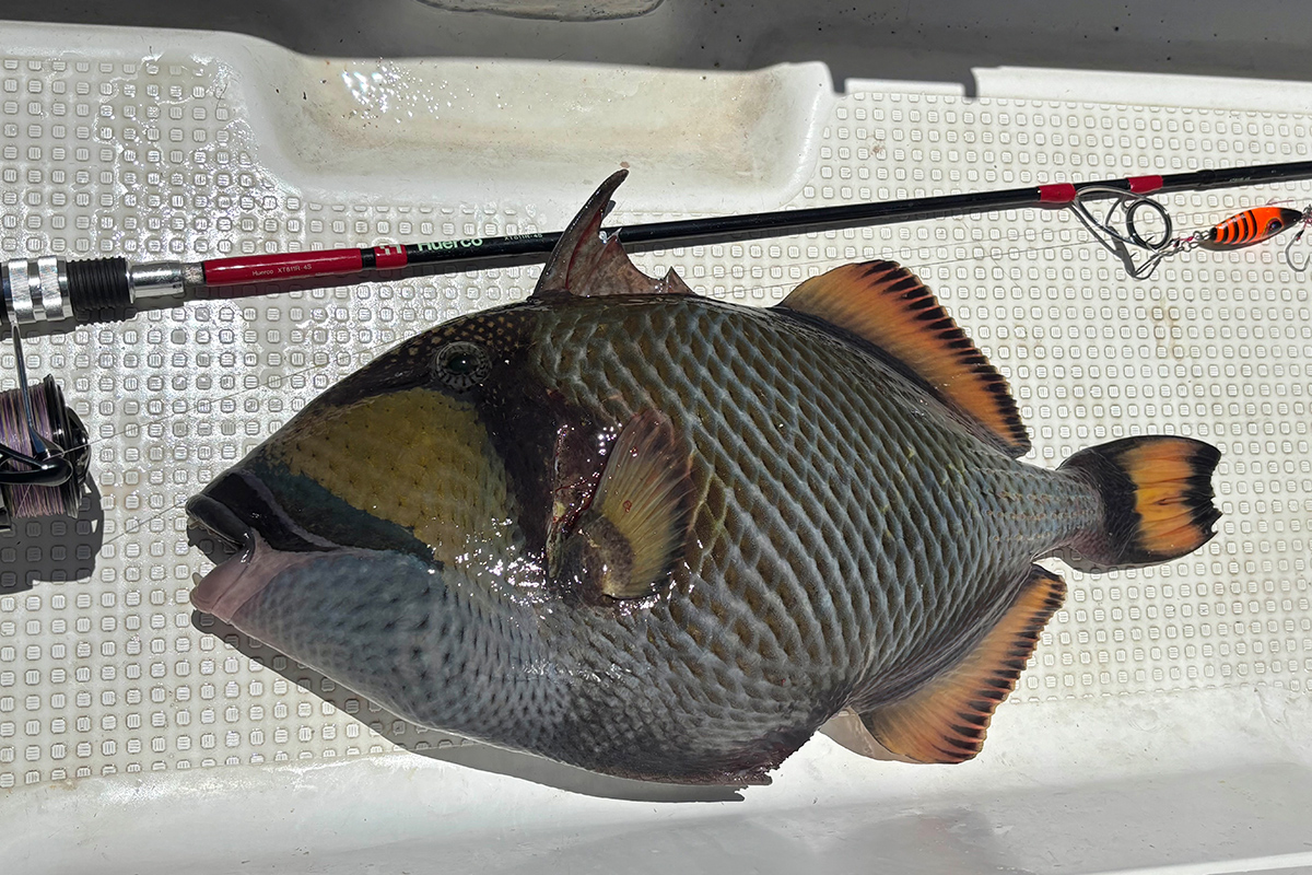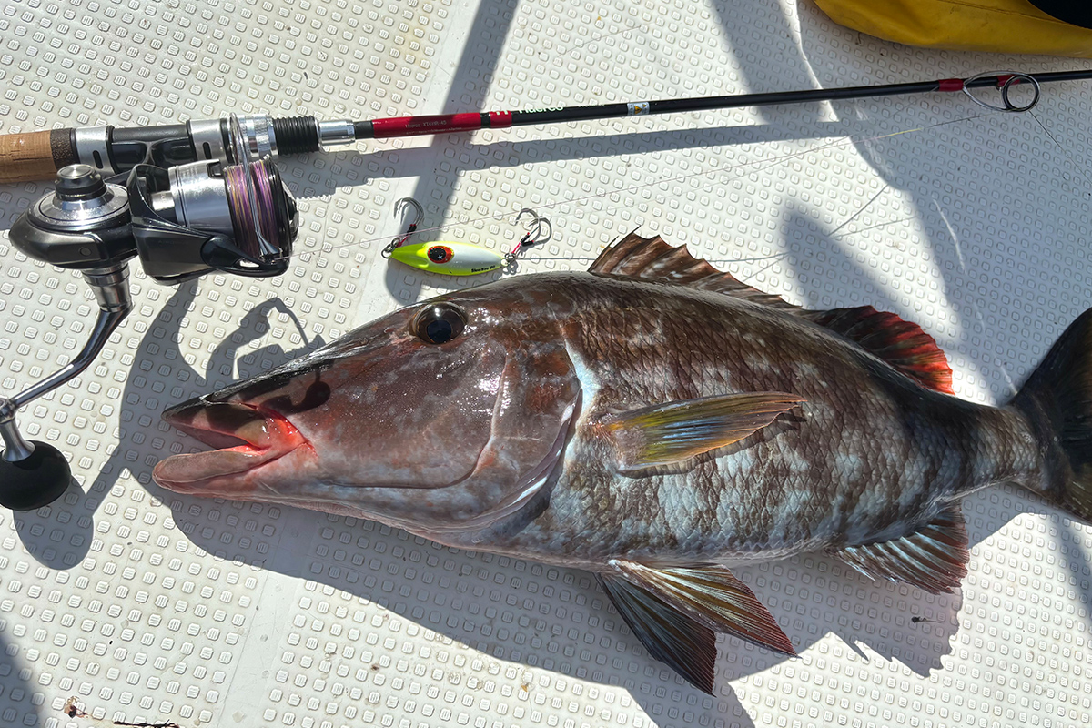 底から5 m以内をスローに誘うと、ムルー(フエフキダイ科の総称)、ゴマモンガラ、ハタ系がヒット。ムルーはシルエットの小さく、フォールで暴れないジグで多く釣れる印象でした。