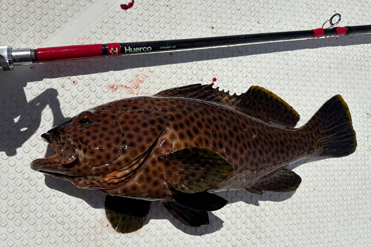 餌を落とすとすぐに反応があり、手元にグルクンが逃げる感覚が伝わりました。あたりがあってから餌を飲ませるためロッドを送り込み、重量感がのってからフッキングするもハリス切れ。仲間も何度もハリス切れをされていて、最初のポイントはサメの巣窟でした。何度かポイントを転々とし、やっと釣り上げられたのはシロブチハタ。沖縄で釣れるハタには同じような模様の種が多くいるので、同定が難しい。初日の泳がせの釣果はこのシロブチハタ2匹で終了でした。