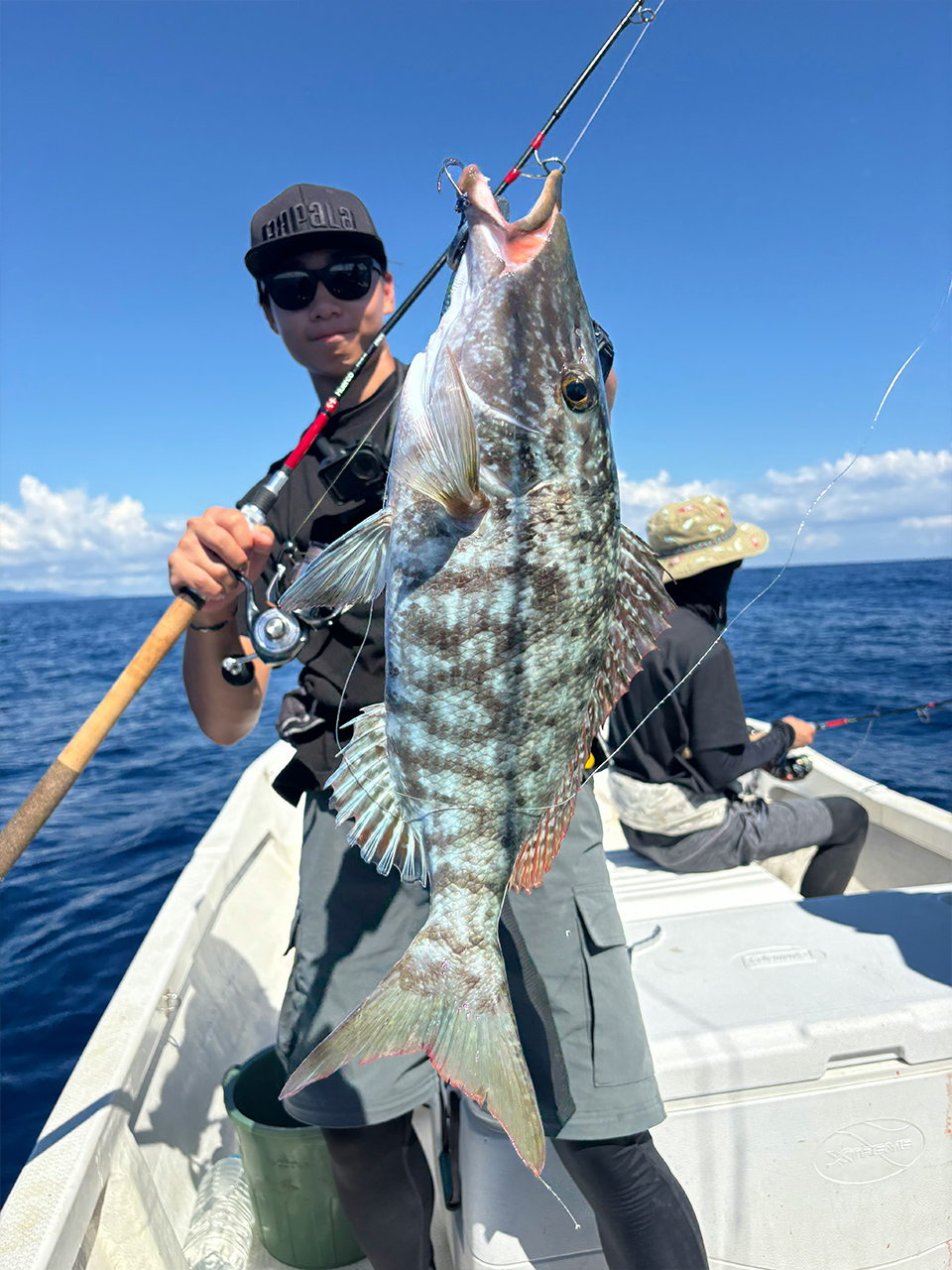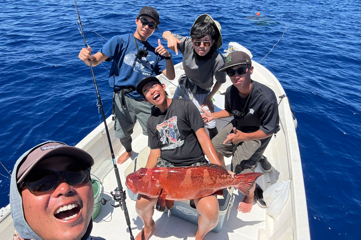 乗船1日目と同じように泳がせ・ライトジギングの予定。朝からサビキで餌となるグルクンを狙いましたが、なかなか釣れず苦戦。ハリスを細くし、なんとか合わせて30匹ほど釣って泳がせスタートしました。しかし、この日は自分には大きなあたりはなく、大物は釣れませんでしたが、同行者の仲間が絶好調。良型のバラハタからバラフエダイ、アオチビキ、本命のコクハンアラまで次々にキャッチ。