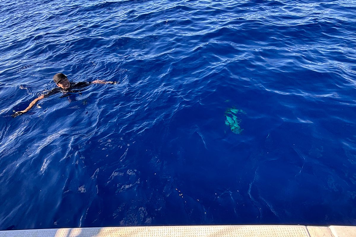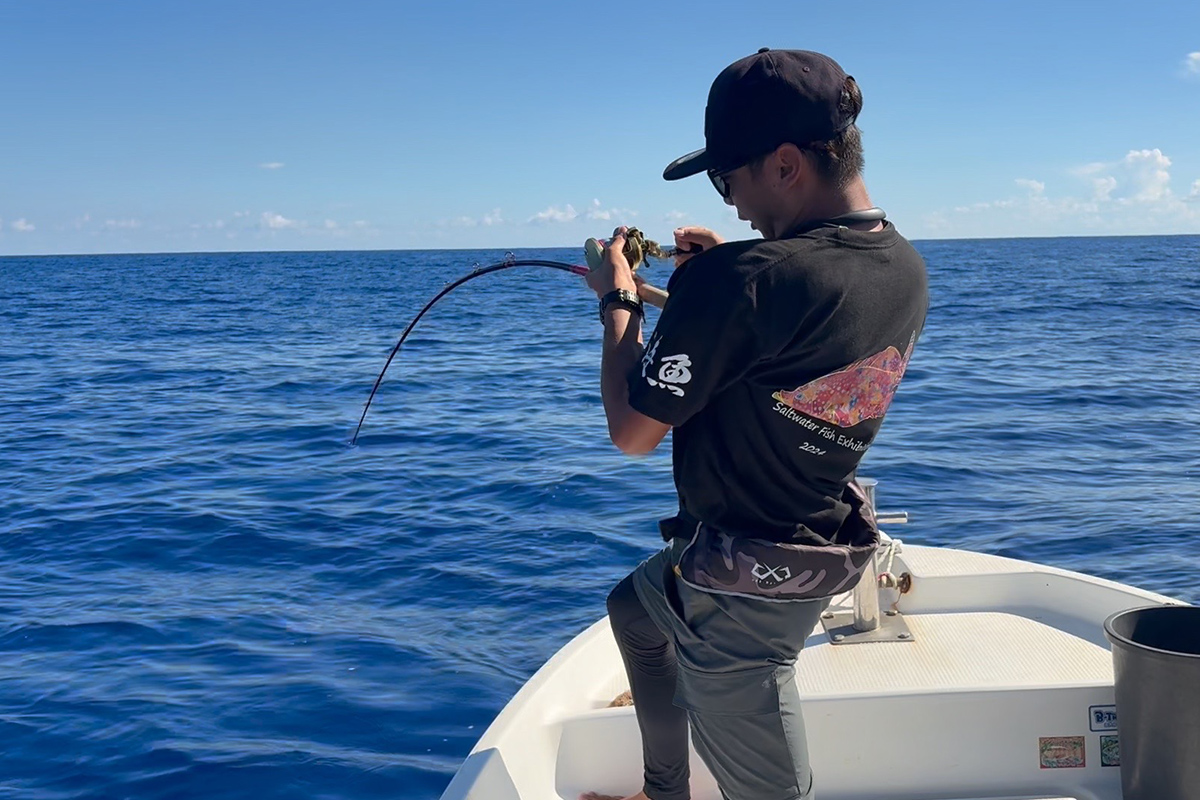 飛び込んで魚を掴もうか、適当な仕掛けを投げて針で引っかけようか、瞬時にいろいろ脳内を駆け巡りました。しかし、運よく数m潜った後に再び浮いてくれて、船を回してもう一度ランディングし、無事に写真撮影することができました。本当にさまざまな奇跡が重なった、忘れられない一日となりました(笑)。
